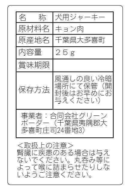 ハンターが捕獲したキョン肉を原材料とした、保存料や添加物ゼロの犬用キョン肉ジャーキー。(内容量25g)